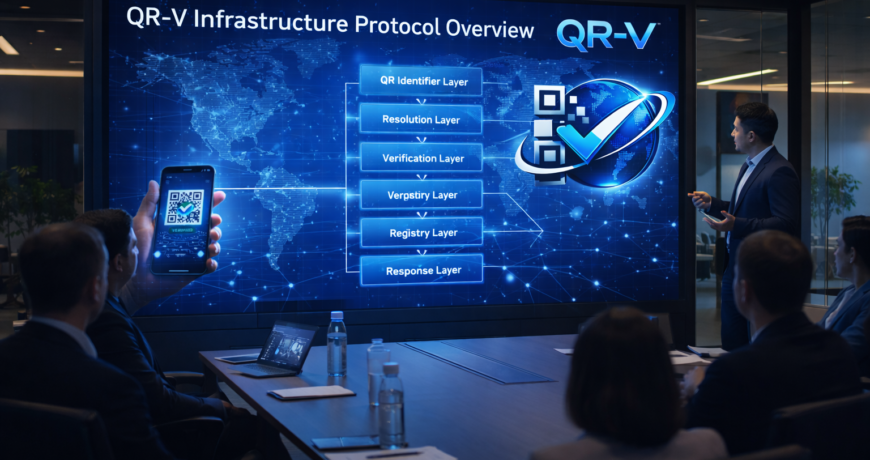A distributed verification architecture that resolves QR-encoded identifiers into registry-anchored records verified through cryptographic signatures.